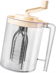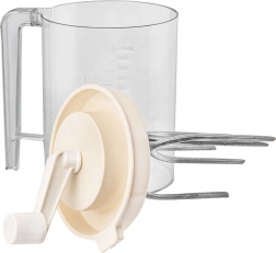 Praktische handmixer met zwengel en geïntegreerde maatbeker van 1,5 l voor eenvoudig kloppen, mengen en het bereiden van beslag. Dankzij de transparante kan met nauwkeurige schaalverdeling in ml en liters, de stevige handgreep en het spatterdeksel maak je snel en schoon slagroom, eiwitschuim, pannenkoekenbeslag en sauzen. De mechanische aandrijving zonder elektriciteit, duurzame materialen en eenvoudig onderhoud maken van deze mixer een betrouwbare hulp in elke keuken.