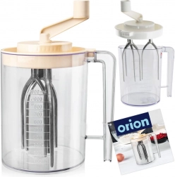 De handmixer ORION combineert een mixer, garde en maatbeker in één. De transparante beker met schaalverdeling (100–10000 ml en 1/4, 1/2, 3/4, 1 l) maakt nauwkeurig doseren van ingrediënten eenvoudig. De mechanische zwengel drijft de interne gardes aan, zodat je efficiënt mengt, zonder elektriciteit en zonder spatten dankzij het gesloten deksel.