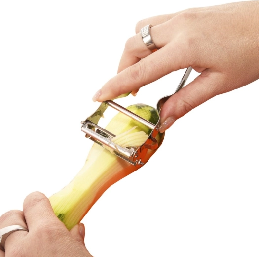 Het draaibare dubbele lemmet zorgt voor glad schillen en het snel maken van dunne reepjes voor salades, bijgerechten en decoratie.