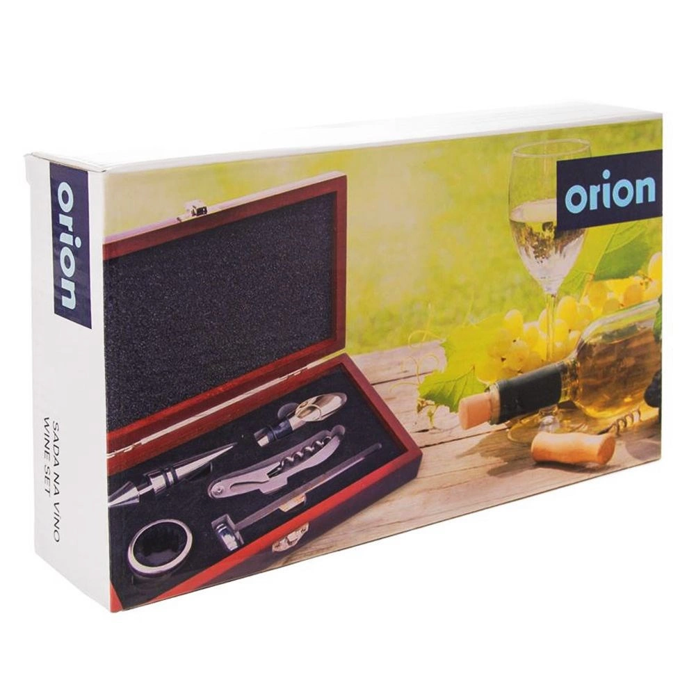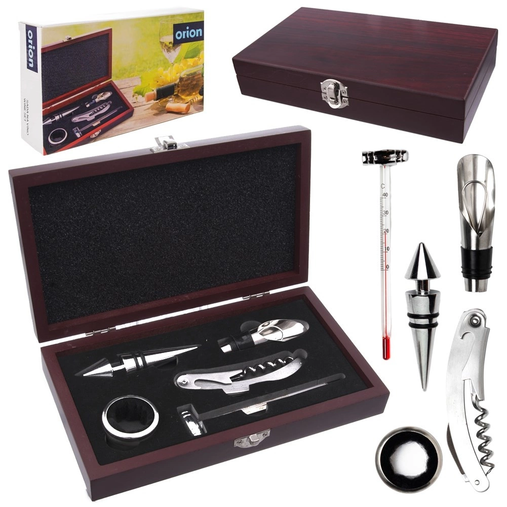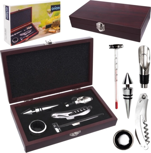 Elegante wijnset in een houten box biedt alles voor comfortabel serveren: kurkentrekker met mesje, flesstop, schenktuit, druppelring en thermometer. Hoogwaardige roestvrijstalen afwerking en doordacht ontwerp zorgen voor duurzaamheid, schoon schenken zonder druppels en de juiste wijntemperatuur. De stijlvolle houten koffer is ideaal als cadeau voor wijnliefhebbers.