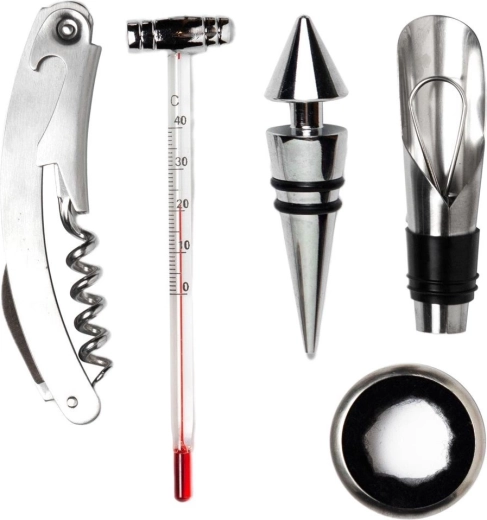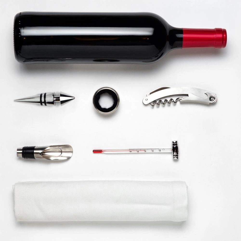 In de doos vind je alles wat je nodig hebt: een kurkentrekker met geïntegreerd mesje voor het eenvoudig verwijderen van folie, een schenktuit voor soepel en druppelvrij schenken, een flesstop om de versheid te behouden, een druppelring tegen vlekken en een thermometer om de ideale serveertemperatuur te controleren.