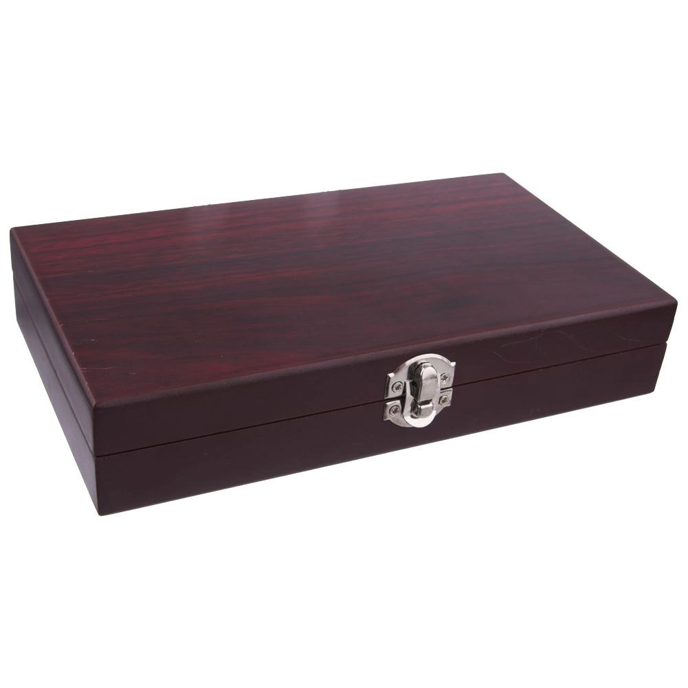 Stevige houten doos met donkere afwerking en metalen sluiting beschermt de accessoires en geeft de set een luxe cadeau-uitstraling.