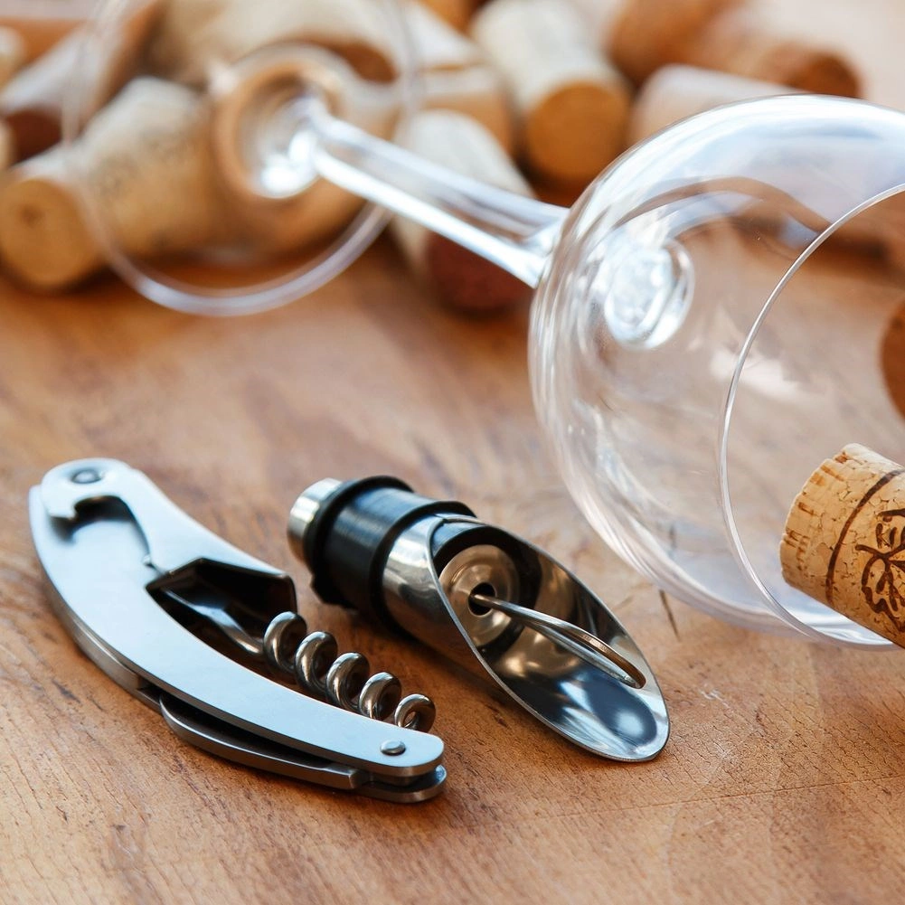 - Kurkentrekker met mesje, flesstop, schenktuit, druppelring, thermometer