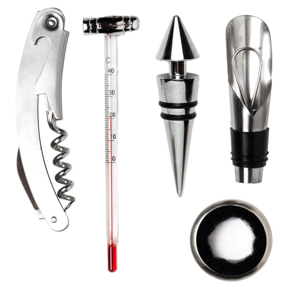 Vijf zorgvuldig geselecteerde tools: kurkentrekker met mesje, flesstop, schenktuit, druppelring en thermometer, overzichtelijk opgeborgen in een schuimrubberen inlay.