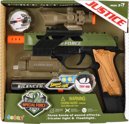 Het plastic pistool is ontworpen om kinderen met interesse in actievolle spellen aan te trekken. De set bevat een vizier, licht en een demper, die de mogelijkheden voor spel en plezier uitbreiden. Het pistool werkt op batterijen:
