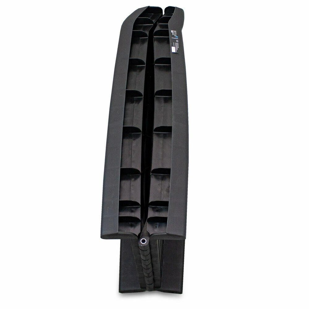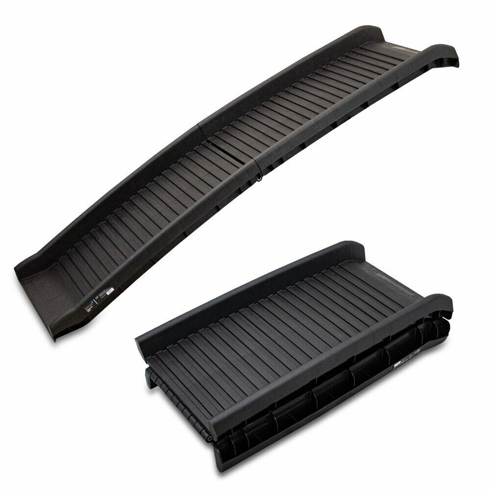 De ramp weegt slechts 5 kg, is makkelijk te dragen en vouwt dankzij het scharnier in het midden snel compact op.
