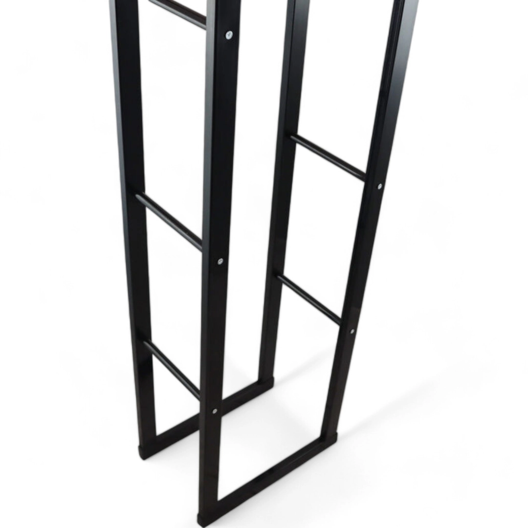 De poedercoating in matzwart (RAL 9005) zorgt voor een elegante look en slijtvastheid. Het rek is na het uitpakken direct klaar voor gebruik – alleen de dopjes op de pootjes plaatsen. Geschikt voor moderne interieurs en als buitenopslag onder een overkapping.