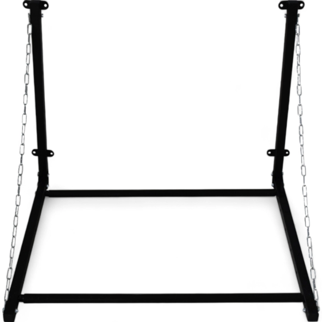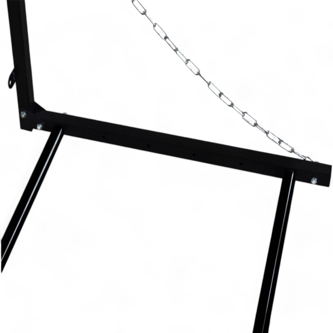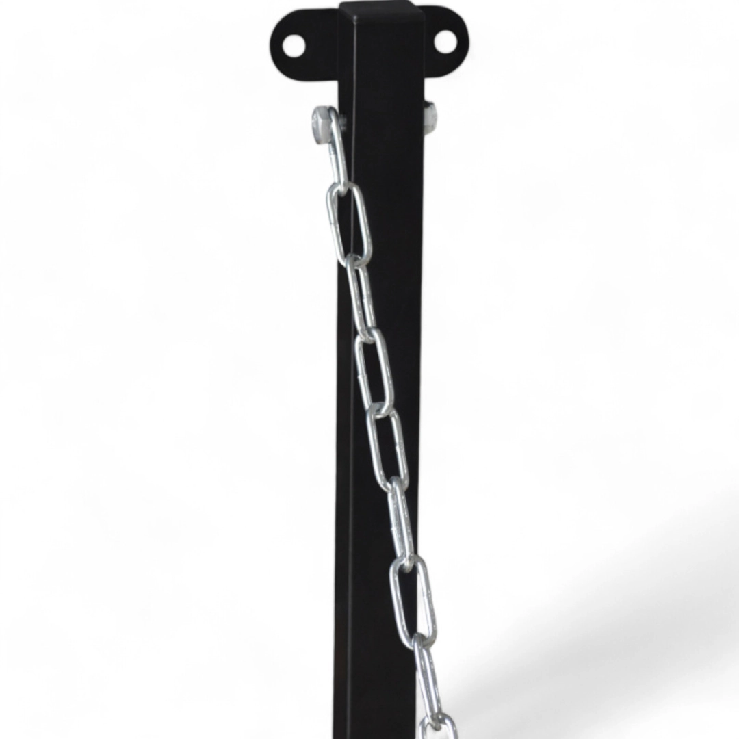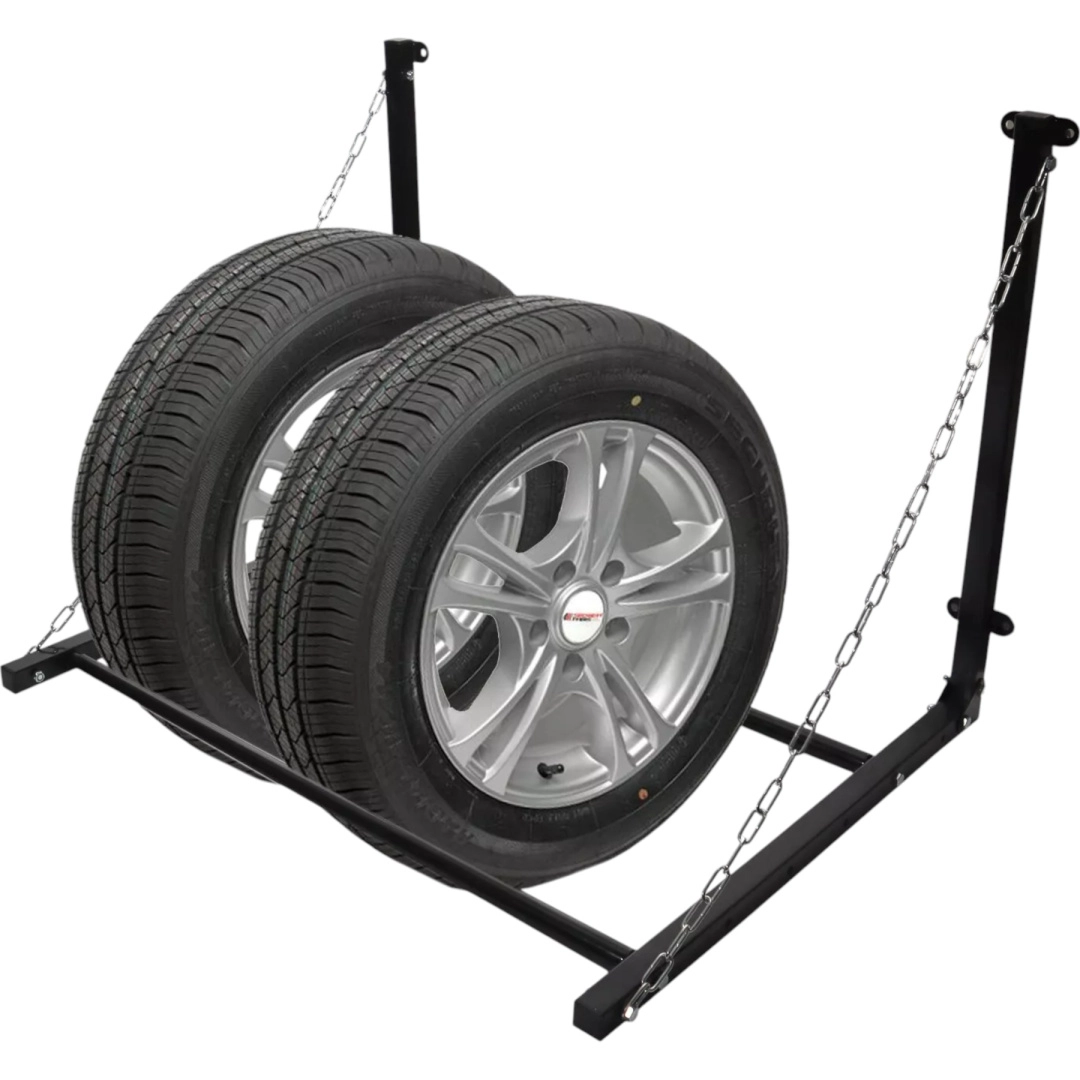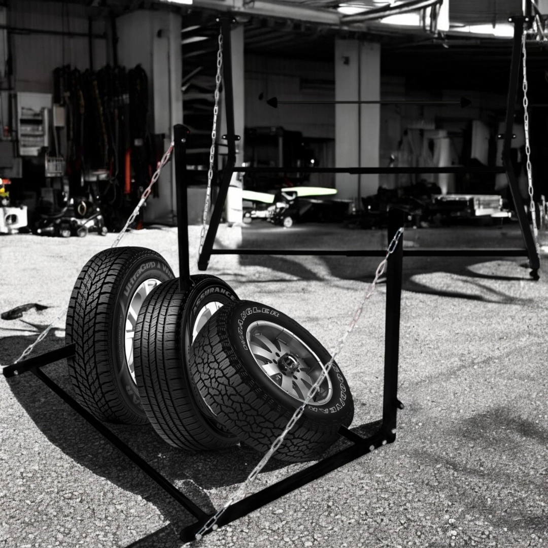 De robuuste stalen constructie met kettingbeveiliging draagt veilig tot vier wielen of banden.