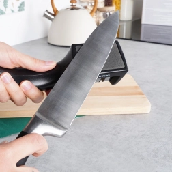 De slijper is licht, duurzaam en eenvoudig te gebruiken en op te bergen — past in elke keukenlade. Geschikt voor gangbare rechte keukenmessen, zoals koks-, universele of trancheermessen van roestvrij of gecoat staal.