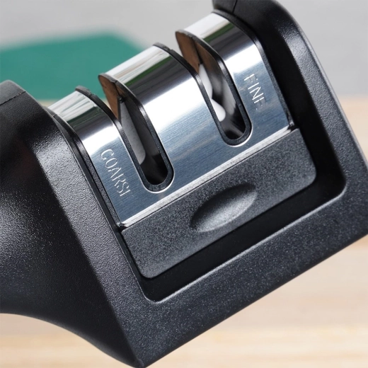 Grove carbide herstelt de vorm van de snede, fijne keramiek polijst en verscherpt — de ideale combinatie voor dagelijks onderhoud van messen.