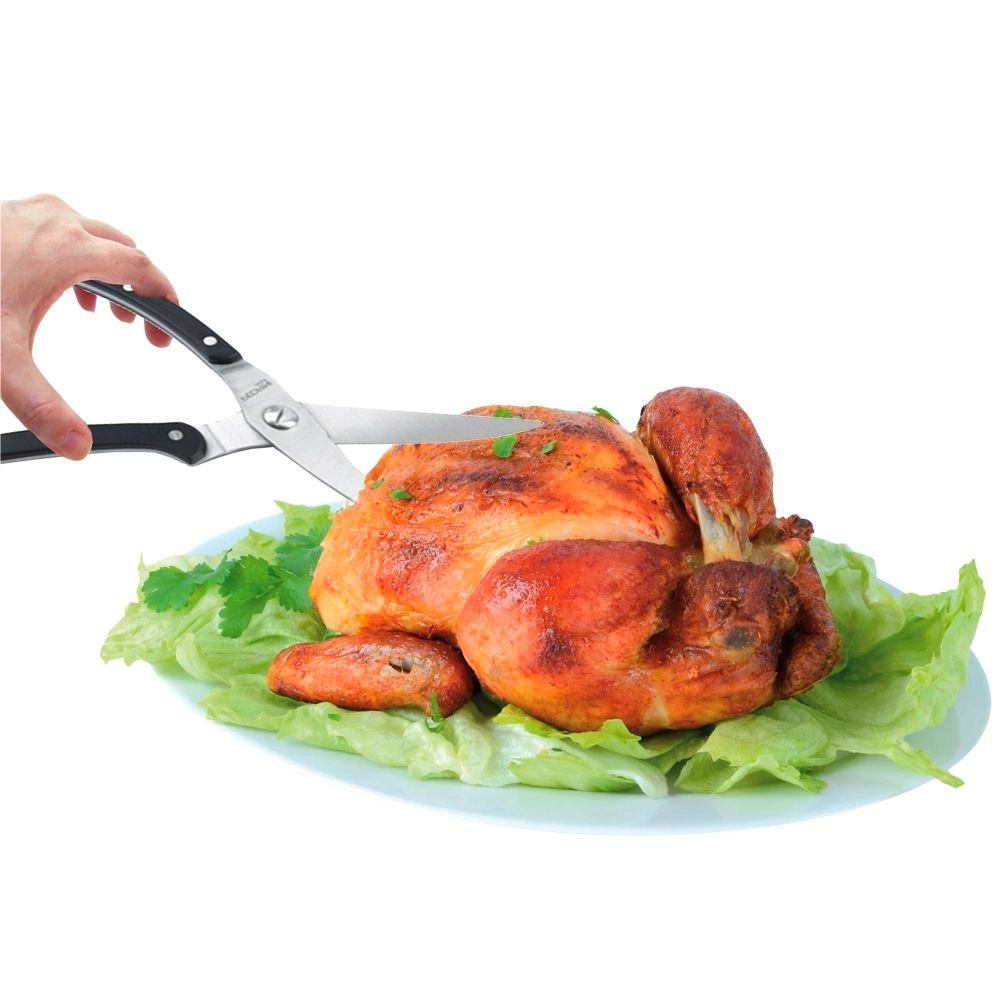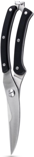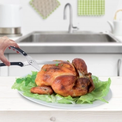 Praktische gevogelteschaar, ontworpen voor het comfortabel portioneren van kip, eend of kalkoen – rauw, geroosterd of gegrild. De scherpe roestvrijstalen bladen kunnen overweg met huid en dunnere botten, terwijl de ergonomische handgrepen van duurzaam kunststof een zekere grip en goede hefboomwerking bieden.