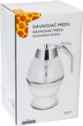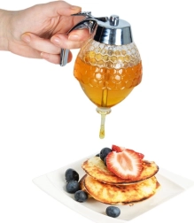 Praktische glazen dispenser voor honing en siropen met een inhoud van 250 ml en een standaard voor nauwkeurige dosering, schoon serveren zonder druppelen en comfortabele bediening met één hand dankzij de trekker in het handvat. Het duurzame, dikwandige glas, de zilverkleurige dop en het elegante design passen op elke tafel en in elke keuken.