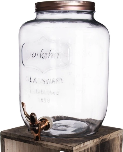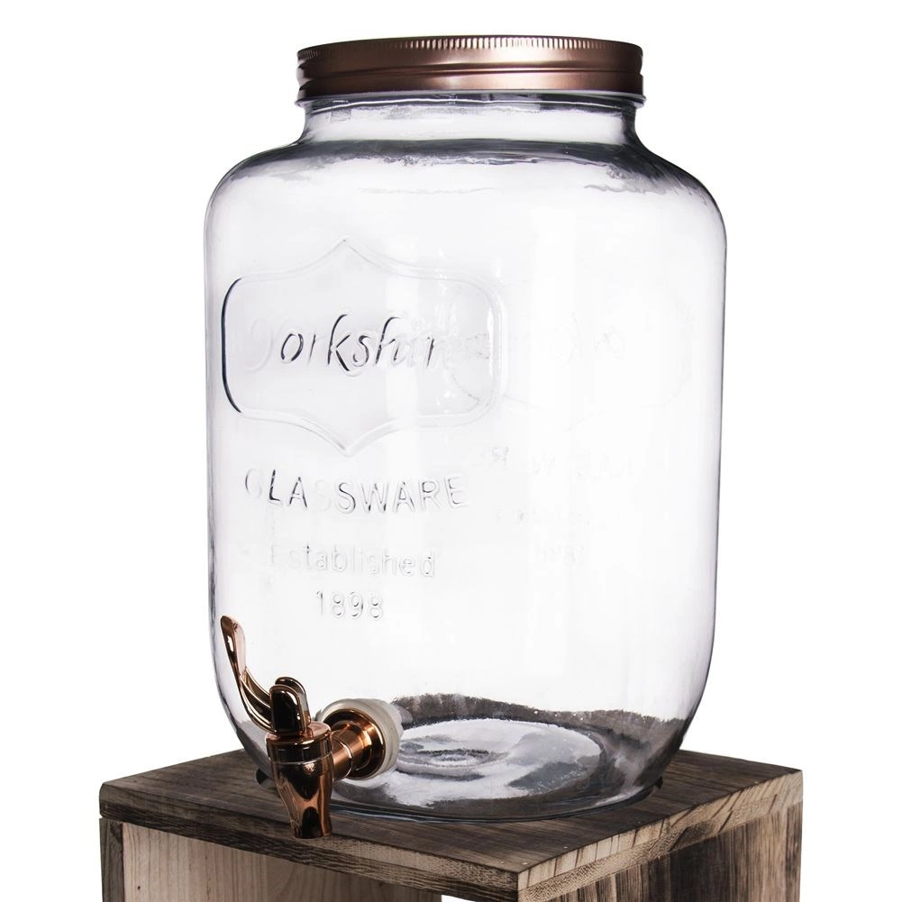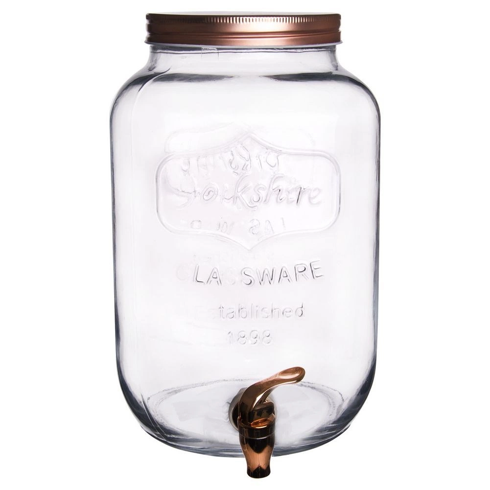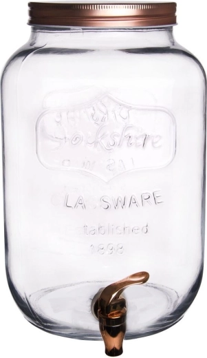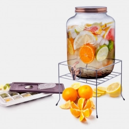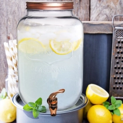 De grote glazen drankenautomaat met kraantje is de perfecte keuze voor het serveren van koude dranken – fruitwater, huisgemaakte limonade, ijsthee en punch. De brede opening maakt het toevoegen van ijs en fruit eenvoudig, terwijl het metalen deksel in koperkleur de inhoud beschermt tegen vuil en insecten.
