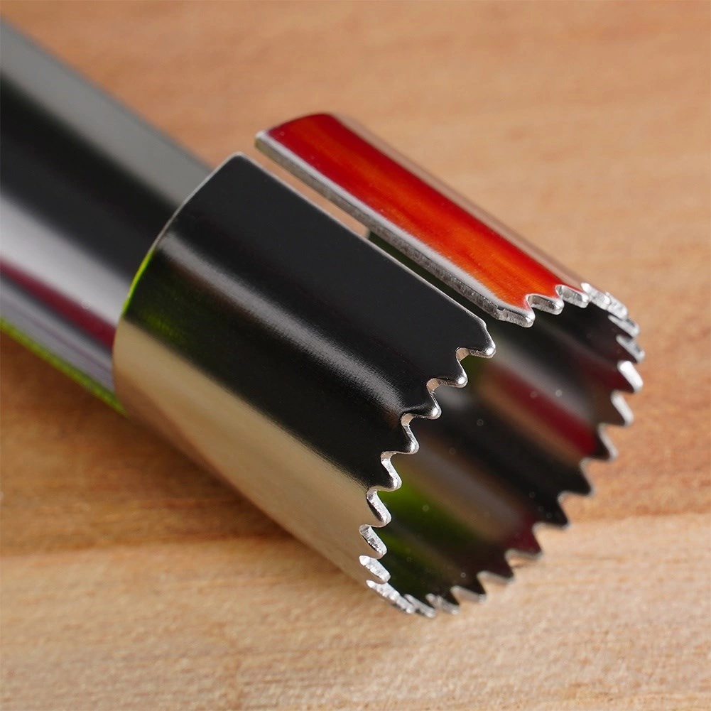 De gekartelde kroon dringt gemakkelijk door schil en vruchtvlees en laat een gladde opening achter, ideaal om te vullen of te decoreren.