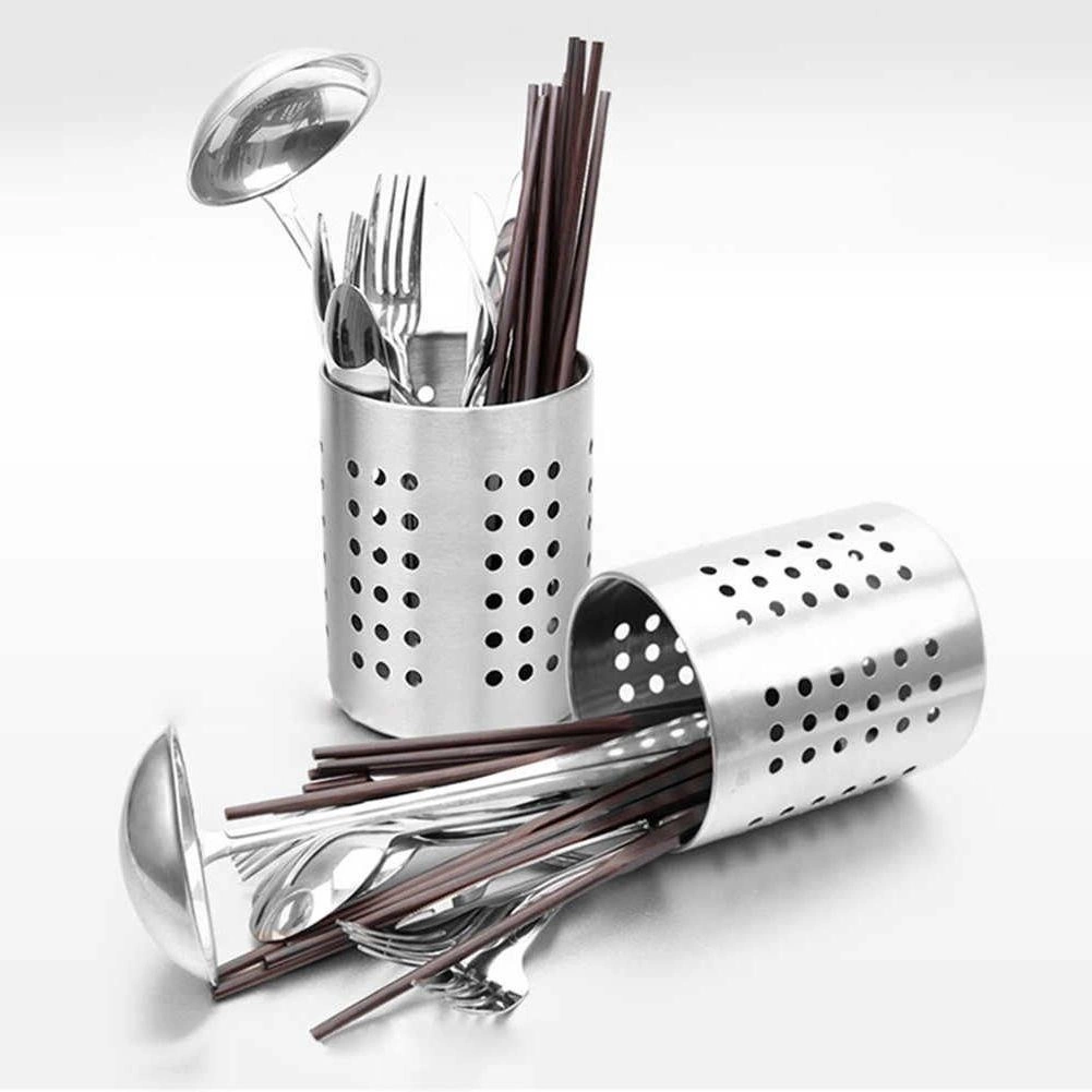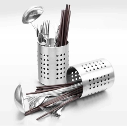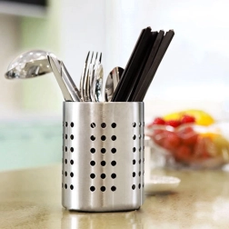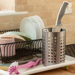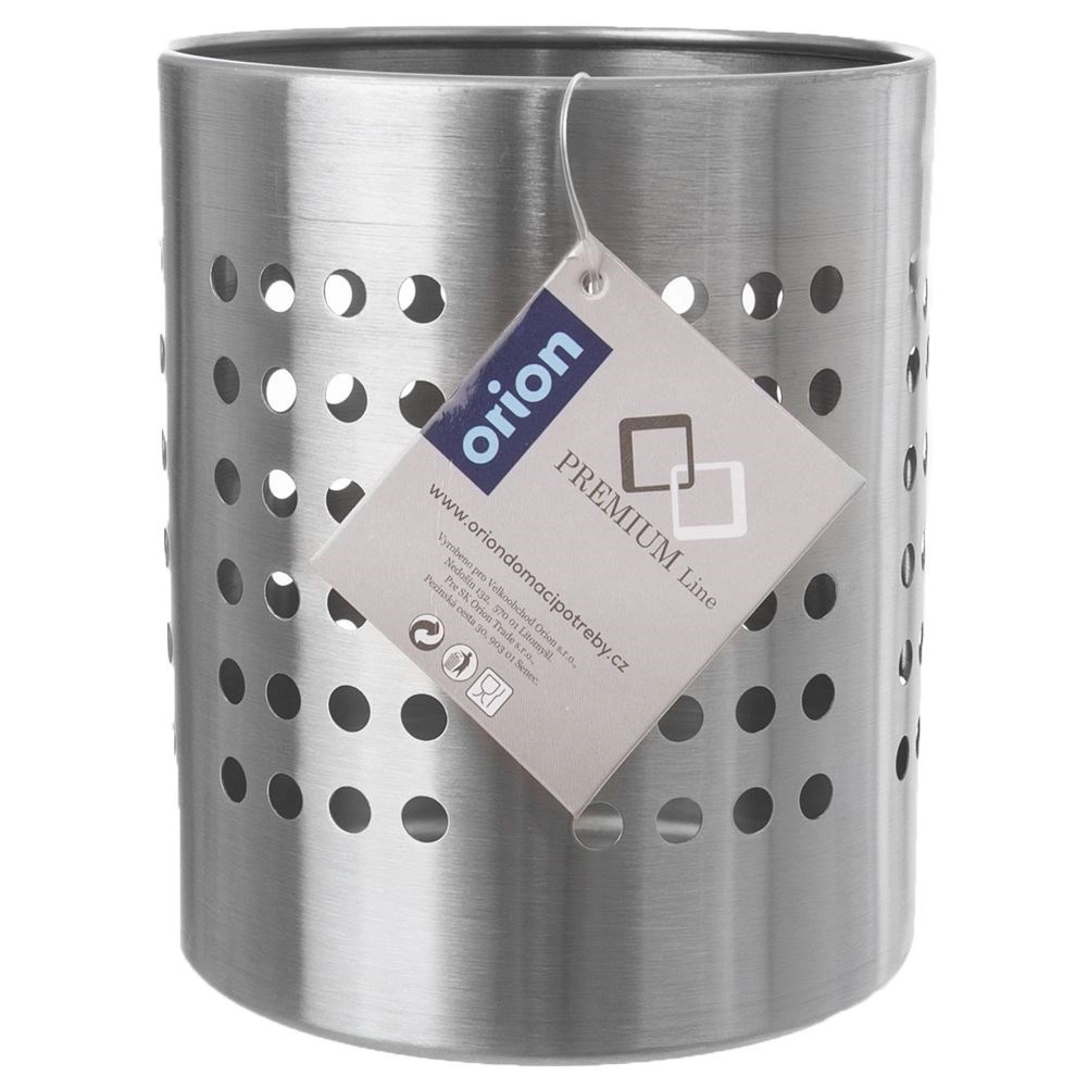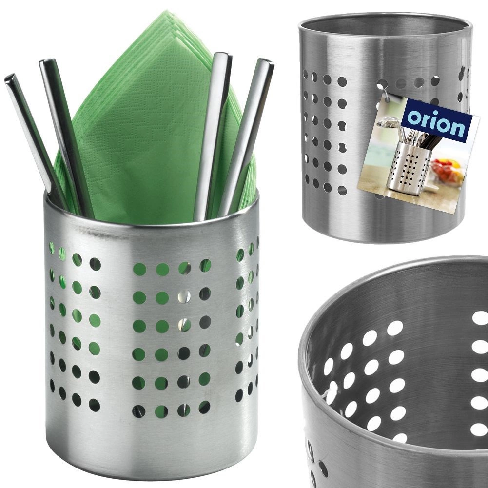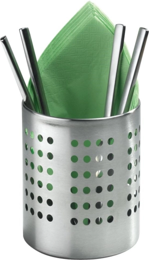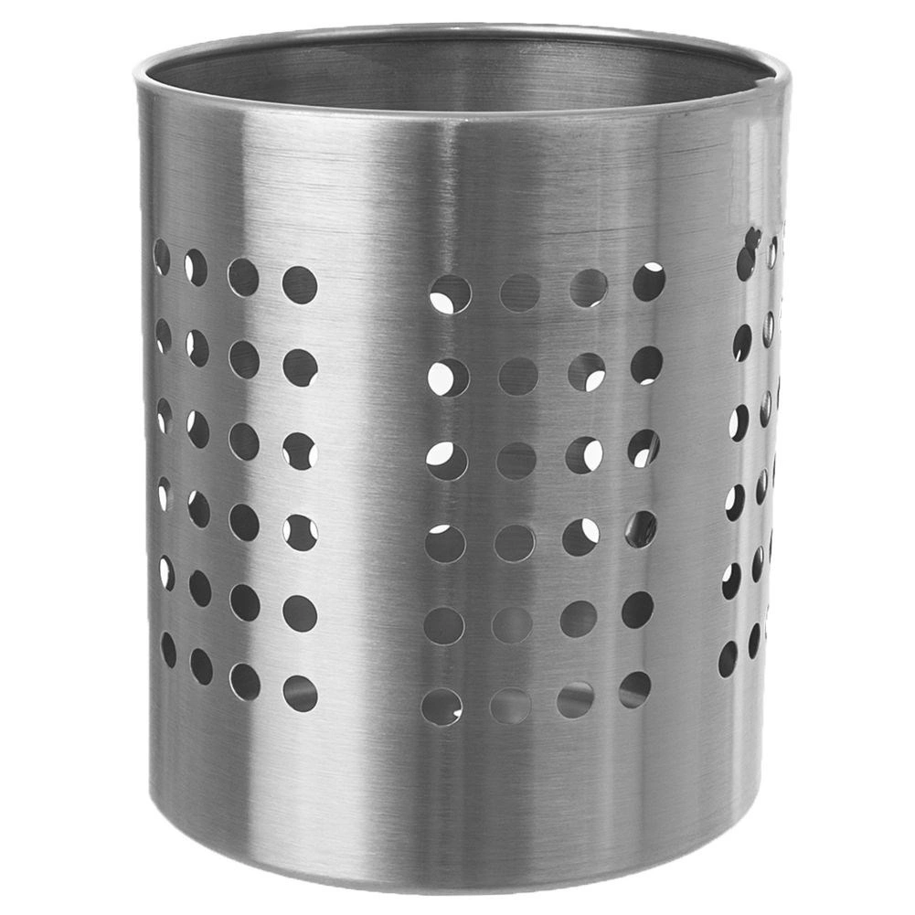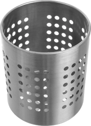 Praktische roestvrijstalen houder voor bestek en keukengerei met een diameter van 12 cm en een hoogte van 13 cm. Dankzij de geperforeerde openingen zorgt hij voor waterafvoer en luchtcirculatie, zodat bestek sneller droogt en hygiënisch schoon blijft. Duurzaam roestvrij staal in zilverkleur, universeel te gebruiken als afdruiprek én organizer en een klassiek design dat in elke keuken past.