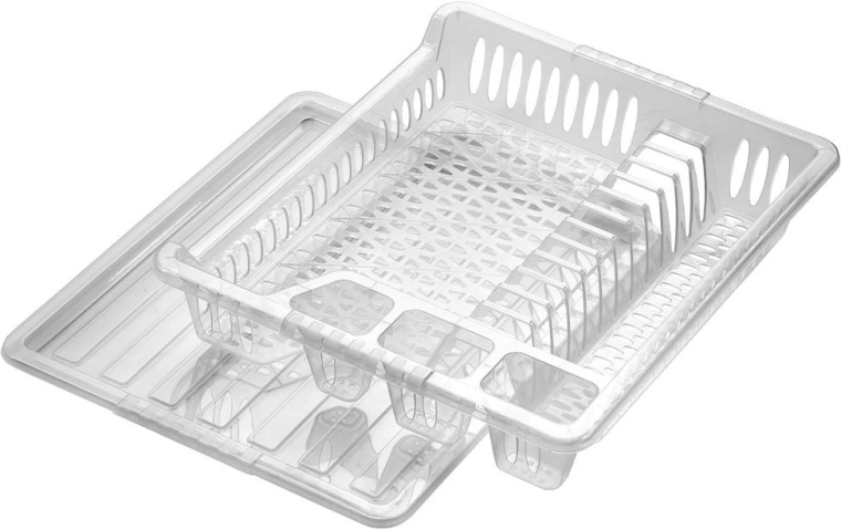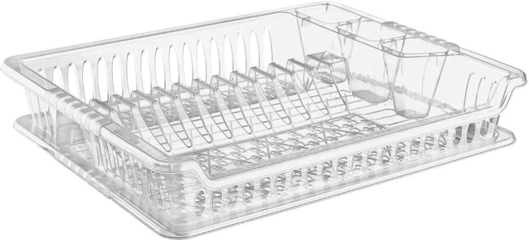Compact afdruiprek voor servies van hoogwaardige halftransparante kunststof met uitneembare afdruiptray. Biedt plaats voor 12 borden, ruimte voor mokken en kommen en 3 vakken voor bestek. Houdt het aanrecht schoon en droog, is makkelijk te reinigen en past bij zowel moderne als klassieke keukens.