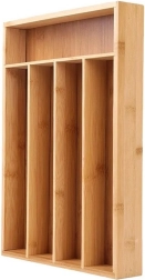 De organizer biedt vijf praktische vakken: vier smalle voor bestek en één bredere voor keukenhulpmiddelen zoals een dunschiller, kurkentrekker of notenkraker. De universele afmetingen 35 × 26 × 5 cm maken plaatsing in gangbare lades eenvoudig en garanderen een overzichtelijke indeling van de inhoud. Reinigen is gemakkelijk – veeg simpelweg af met een vochtige doek.