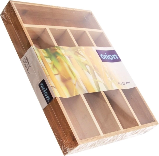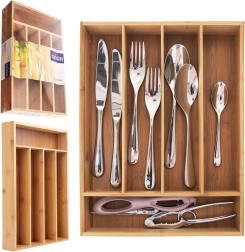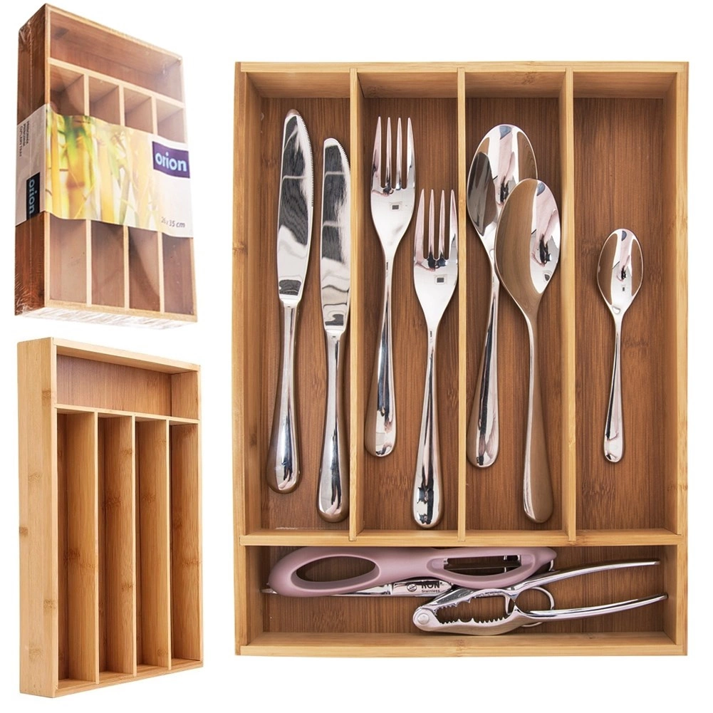 Praktische bamboe lade-organizer met afmetingen 35 × 26 × 5 cm zorgt ervoor dat je bestek en keukengerei altijd netjes en overzichtelijk opgeborgen zijn. Gemaakt van natuurlijk bamboe, dat duurzaam en vochtbestendig is, en biedt vijf overzichtelijke vakken voor vorken, messen, lepels en klein keukengerei. De universele maat past in de meeste lades en het gemakkelijke reinigen zorgt voor probleemloos onderhoud.