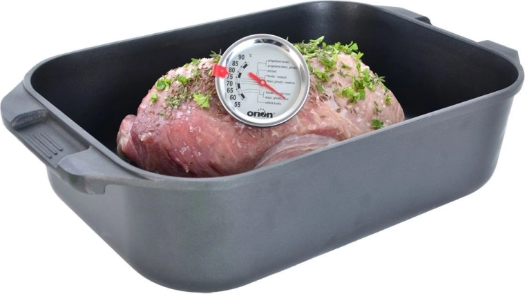 Betrouwbare keukenthermometer met een roestvrijstalen sonde van 12 cm meet direct in het vlees en zorgt ervoor dat braadstukken, gevogelte en steaks precies worden bereid zoals u het wenst. De duidelijke analoge wijzerplaat biedt snelle aflezing van de temperatuur in het bereik 50–90 °C, ideaal voor de meeste vleessoorten en warme gerechten.
