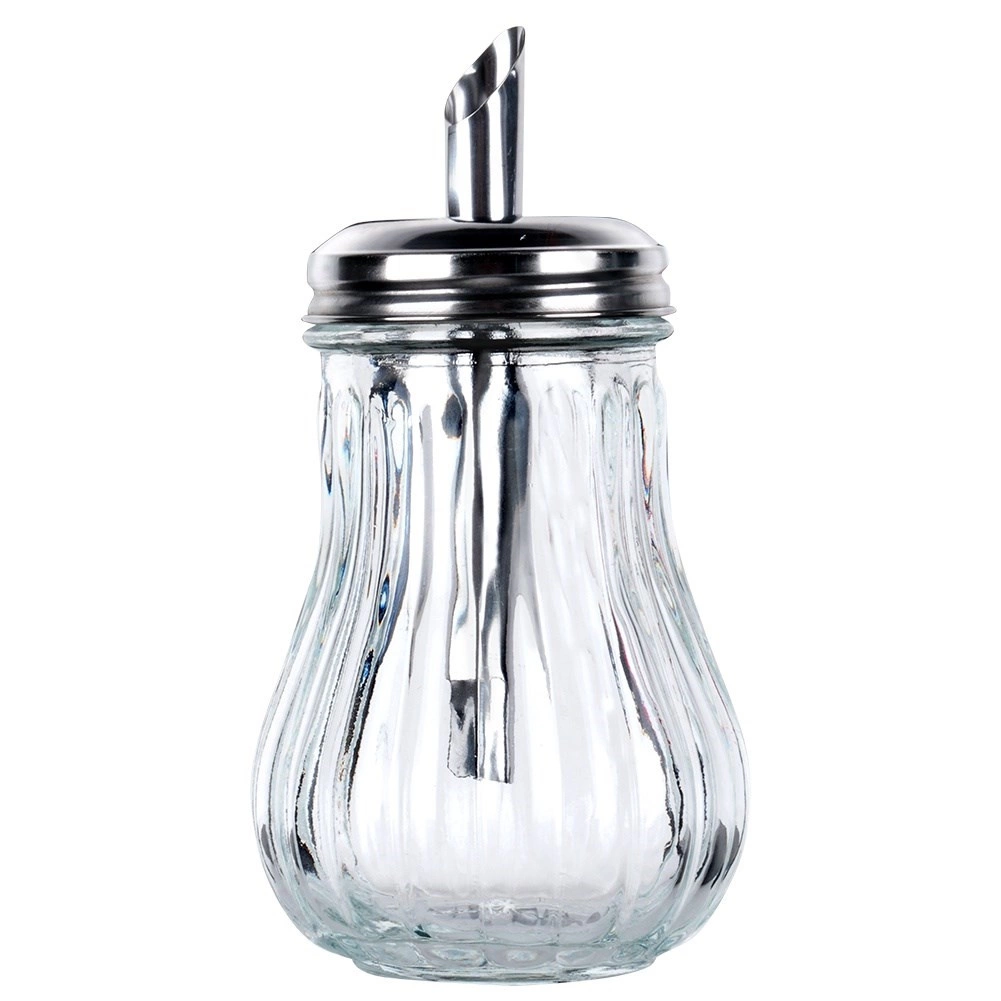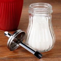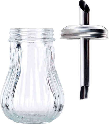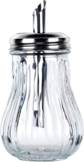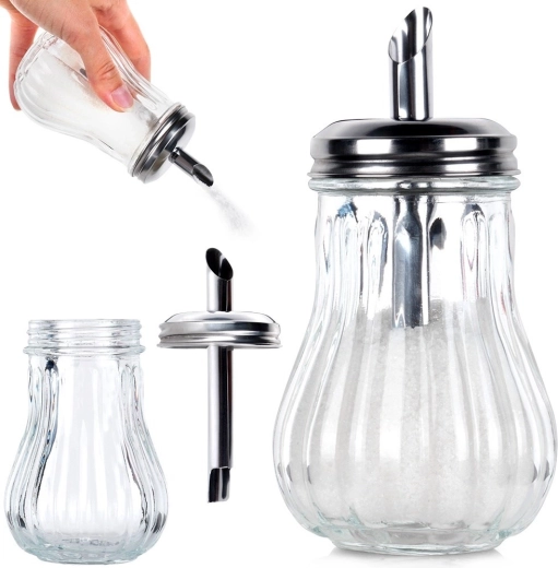 Deze glazen suikerdoseerder met praktische dispenser zorgt voor snel en schoon doseren van koffie, thee en desserts. Eén kantelbeweging staat gelijk aan circa één theelepel, zodat je telkens dezelfde hoeveelheid strooit. Het heldere glas biedt direct zicht op de inhoud, terwijl de roestvrijstalen afsluiting met schuine tuit zorgt voor nauwkeurig en gecontroleerd strooien zonder knoeien.