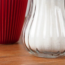 Transparant glas voor direct inzicht in de inhoud en ribbelstructuur voor een zekere, antislip grip.