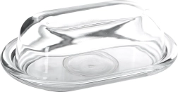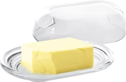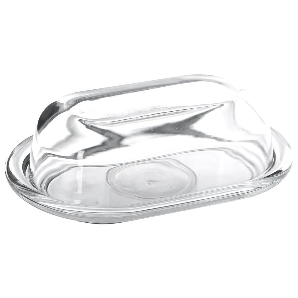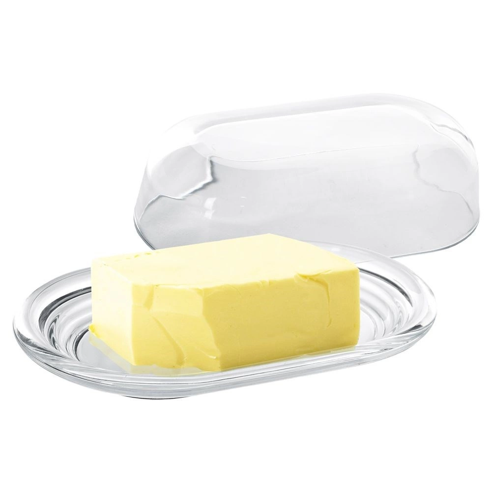 Helder glas en een gevormde basis zorgen voor elegant serveren en snelle visuele controle van de hoeveelheid boter in de koelkast of op tafel.