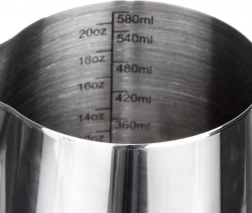 Een stijlvolle en functionele hulp voor barista’s en koffieliefhebbers. De kan is gemaakt van hoogwaardig roestvrij staal dat gemakkelijk te reinigen is, corrosiebestendig is en warmte uitstekend geleidt. De interne markeringen per 60 ml maken nauwkeurig afmeten van melk of room mogelijk voor de perfecte cappuccino of latte.