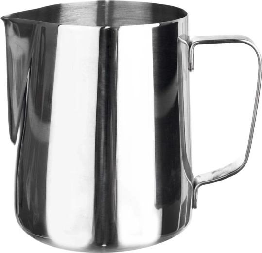 Praktische roestvrijstalen melkkan met een inhoud van 580 ml en interne maataanduiding voor nauwkeurige dosering – ideaal voor het bereiden van koffie en latte art. Biedt duurzame uitvoering van roestvrij staal, comfortabel schenken dankzij de precieze tuit en veilige grip. Geschikt voor verwarmen op gas-, elektrische en keramische kookplaten (niet geschikt voor inductie).