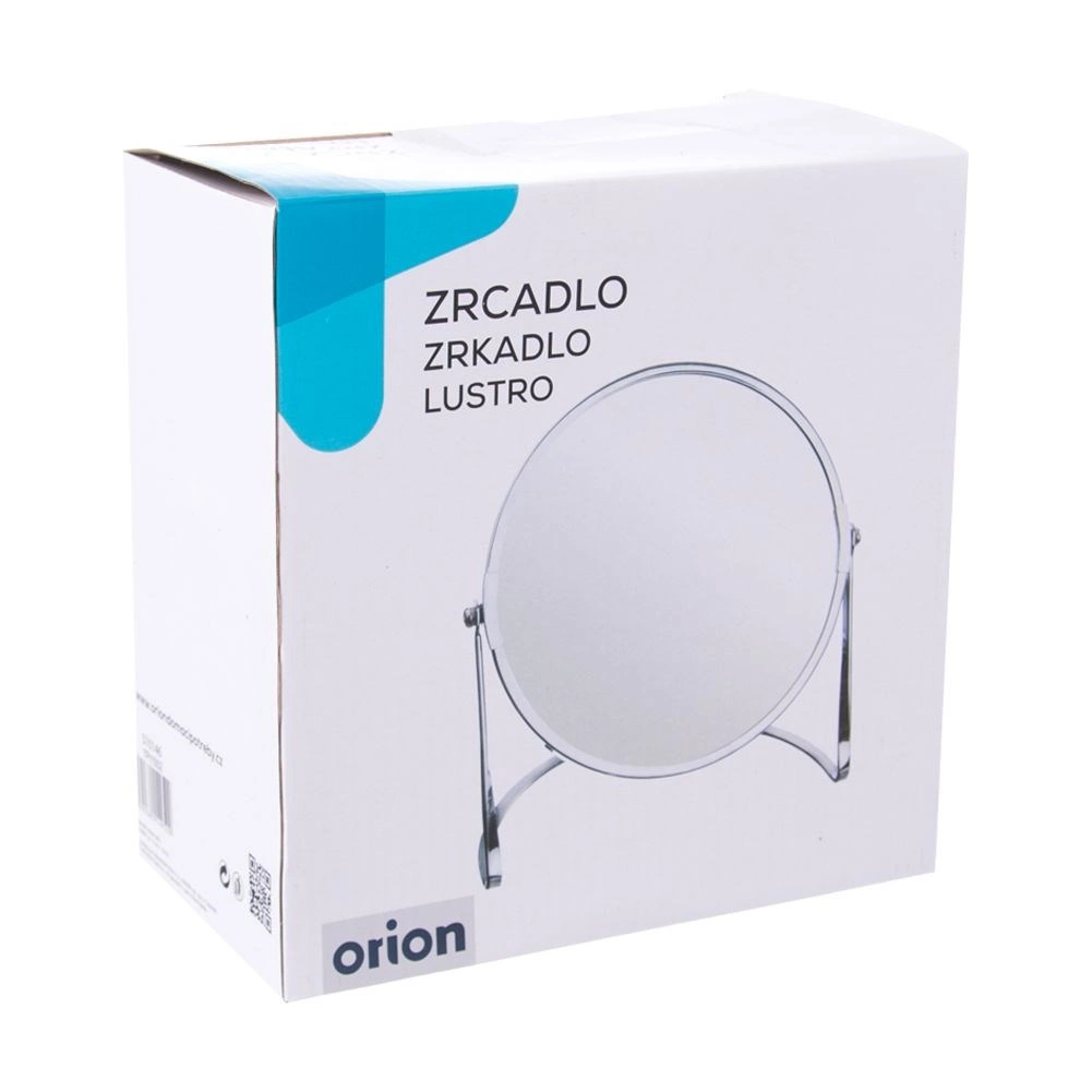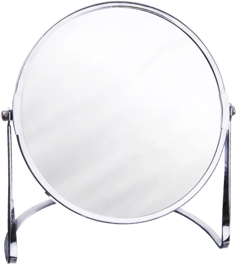 Elegant dubbelzijdig cosmeticaspiegeltje op standaard met een zilveren frame, ideaal voor make-up en dagelijkse verzorging. Biedt zowel klassische weergave als 2× vergroting, heeft een spiegeloppervlak met een diameter van 17 cm en oogt stijlvol en minimalistisch in elk interieur.