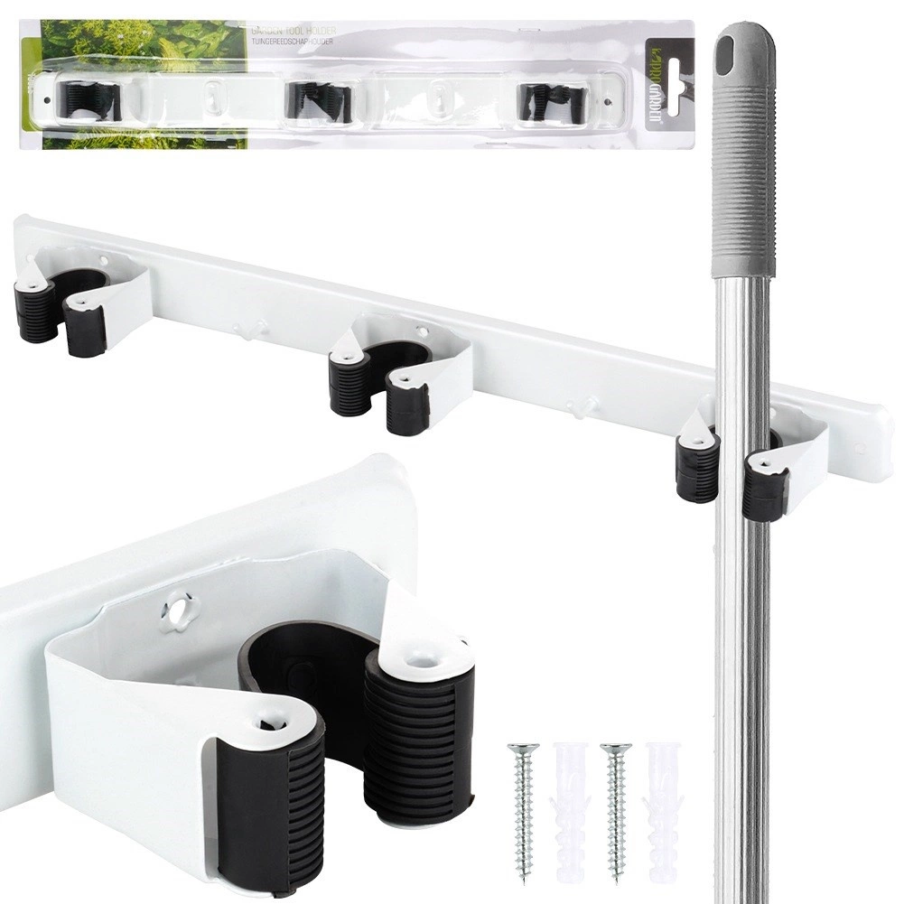 Houdt tot drie stelen met gereedschap vast en biedt tegelijk twee haken voor accessoires – doekjes, handveger of blik.