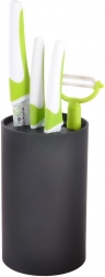 De compacte cilindervorm in het zwart bespaart ruimte op het aanrecht, houdt gereedschap rechtop en past perfect in zowel moderne als klassieke keukens.
