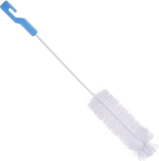 Lange flessenborstel van 41 cm met een blauw handvat en dicht, wit vezel dat effectief de binnenkant van smalle vaten reinigt. Dankzij de slanke vorm reikt hij gemakkelijk tot op de bodem en in de hals. Heeft een praktische haak om op te hangen en is licht, maar tegelijk duurzaam. Ideaal voor flessen, vazen, karaffen en babyflesjes.