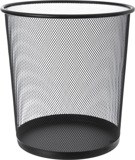 Praktische metalen prullenbak met een inhoud van 6 liter, met ademende gaasstructuur en een duurzame metalen constructie. Dankzij de elegante zwarte afwerking past hij in kantoor, thuiskantoor en wachtkamer. Lichtgewicht om te verplaatsen, eenvoudig te reinigen en past ook in een kast of onder een bureau.