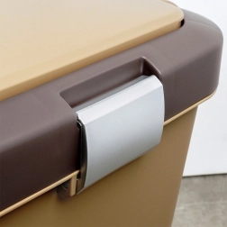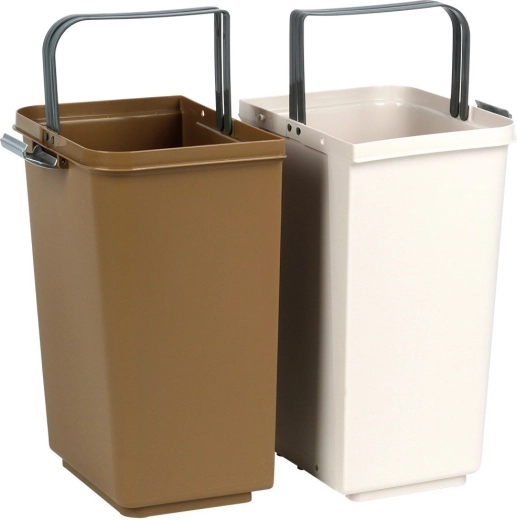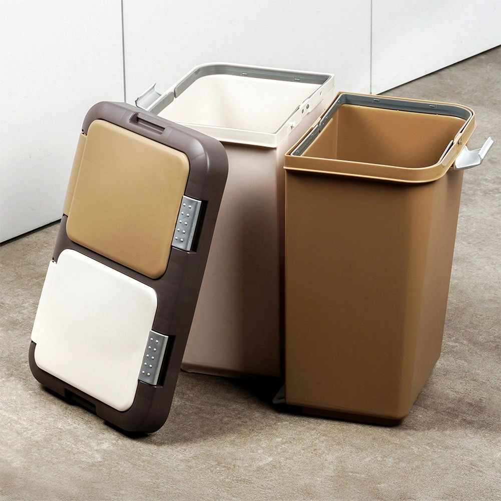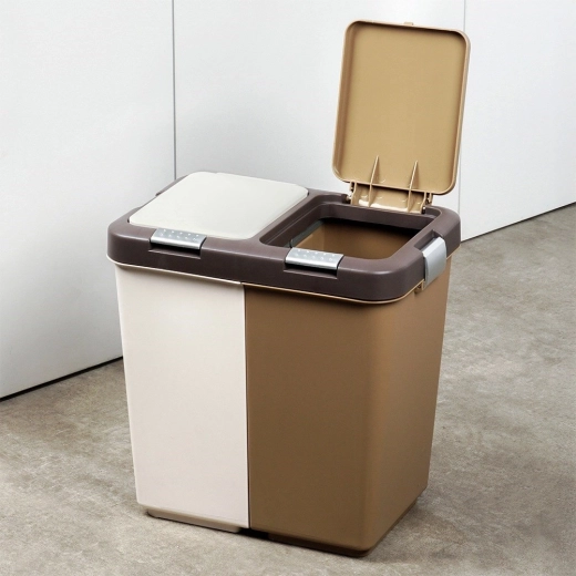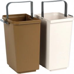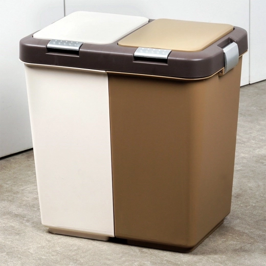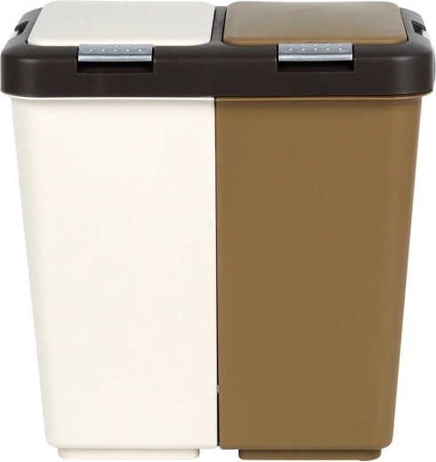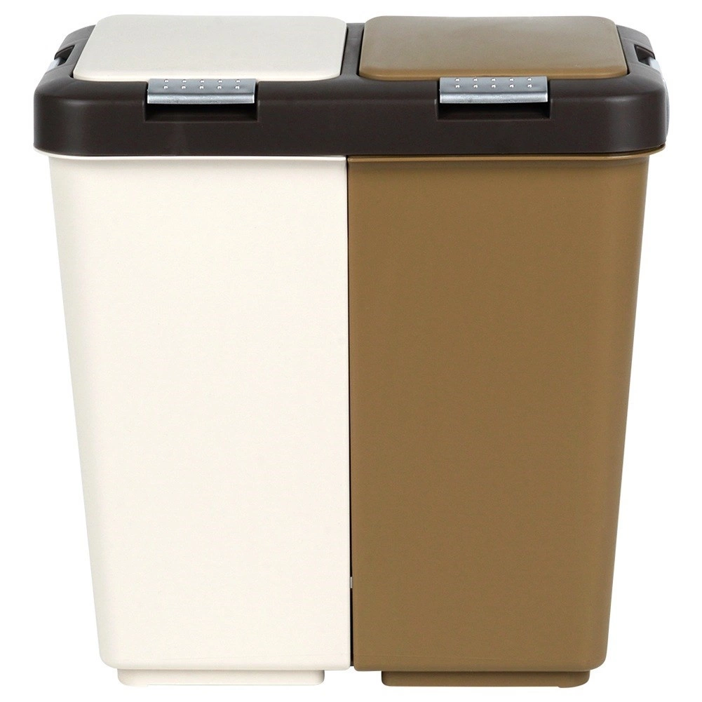 De bak is gemaakt van duurzaam kunststof in wit met bruin en past in moderne en kleinere ruimtes. Compacte afmetingen besparen meer ruimte dan twee afzonderlijke bakken en beperken geurverspreiding dankzij afsluitbare deksels.