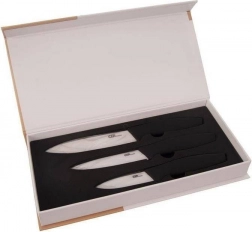 Deze universele set bevat een klein, middelgroot en groot mes voor precies snijden, portioneren en schillen. Het volledig keramische lemmet zorgt voor een gladde snede, voedsel plakt er minder aan en behoudt beter zijn vitamines en voedingswaarden. Dankzij de ergonomische handgrepen van hoogwaardig zwart kunststof liggen de messen comfortabel in de hand en glijden ze niet weg.
