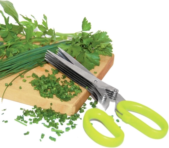Vijf parallelle roestvrijstalen bladen snijden kruiden snel en gelijkmatig – ideaal voor dagelijks koken.