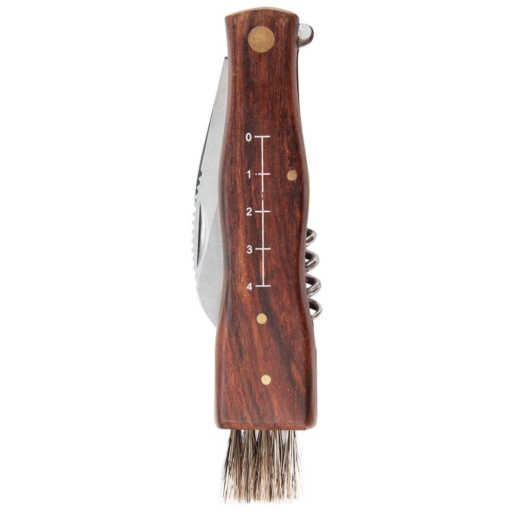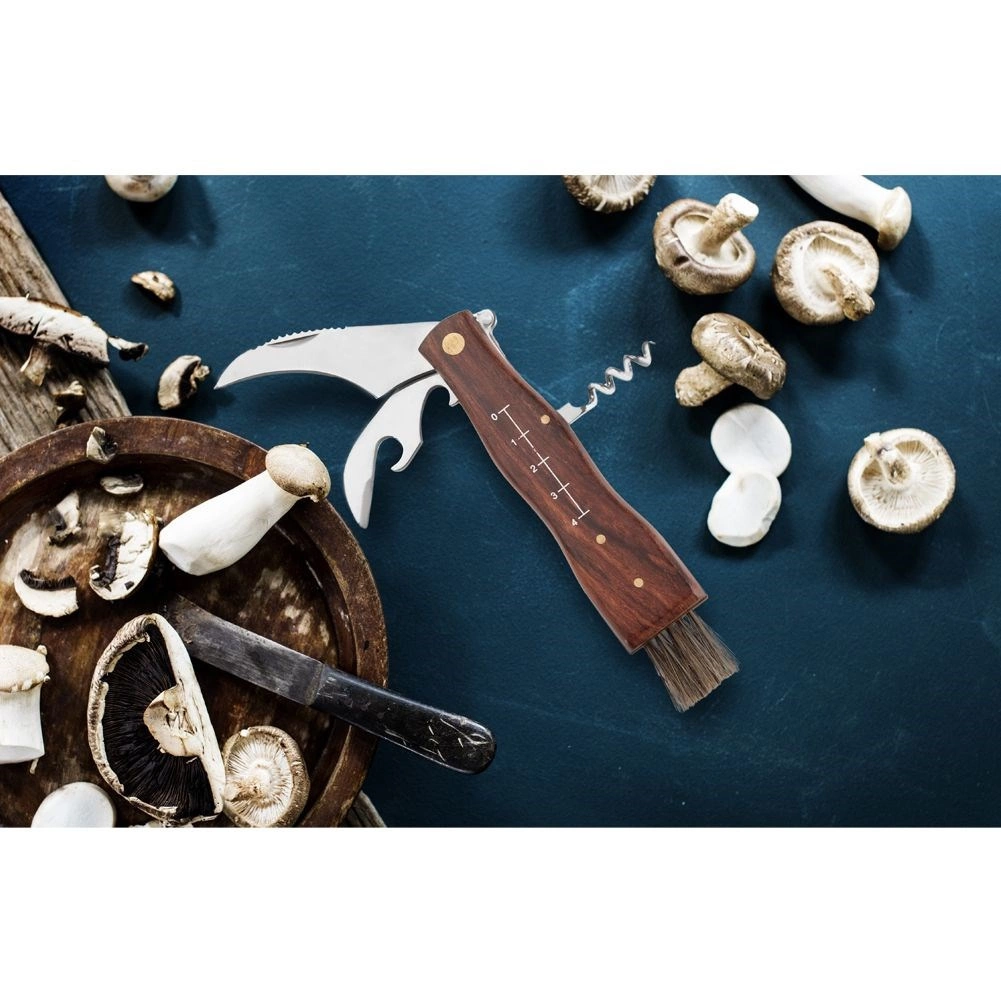 Ontdek een betrouwbaar paddenstoelenmes van hoogwaardig roestvrij staal met een comfortabel houten handvat. Het speciaal gevormde, gebogen lemmet van 8 cm maakt voorzichtig afsnijden, vastpakken en eerstereiniging direct in het veld mogelijk. Het geïntegreerde borsteltje verwijdert eenvoudig zand en aarde, terwijl de aangegeven maatverdeling 1–4 cm op de handgreep helpt om snel de diameter van je vondsten te beoordelen.