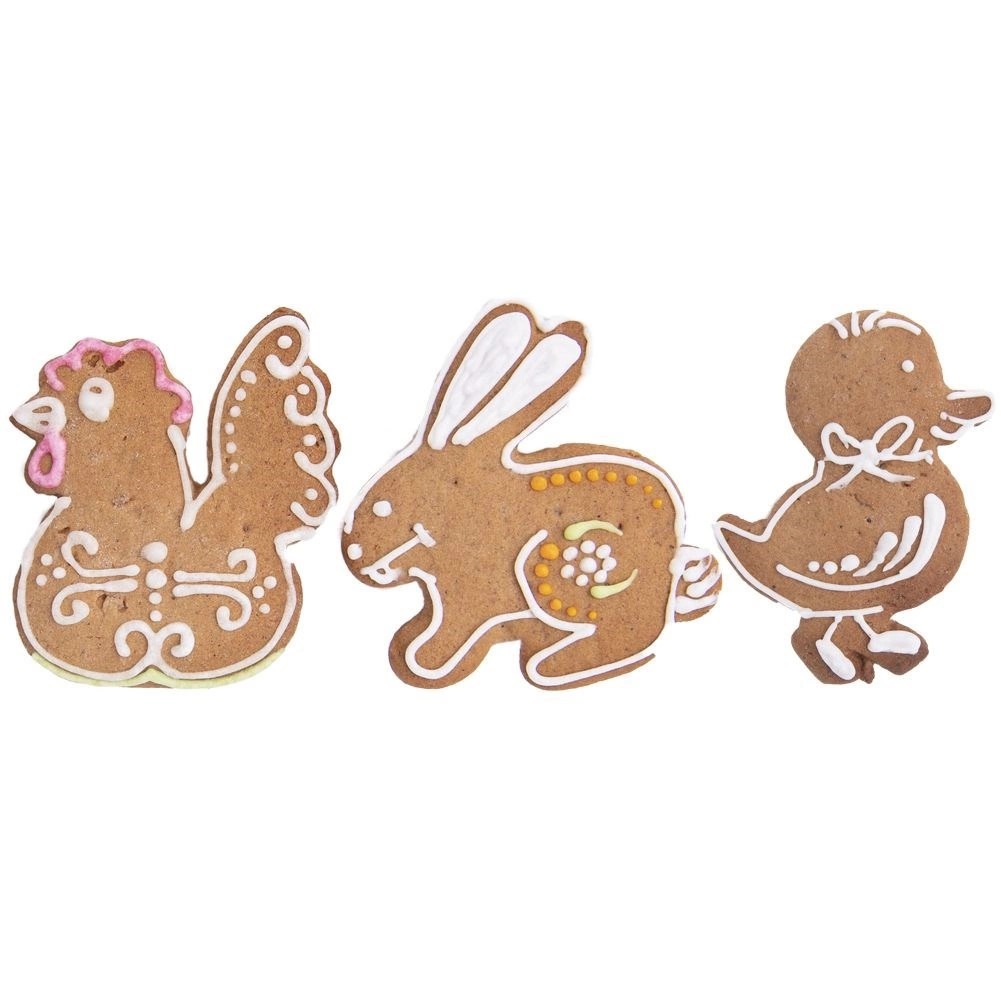 Een hen, een haasje en een eendje in één set voor speels en thematisch bakken, waar zowel kinderen als volwassenen blij van worden.