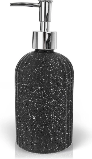 Stijlvolle dispenser voor vloeibare zeep of afwasmiddel, gemaakt van hoogwaardig glas in donkergrijs met een gemarmerde structuur. De metalen glans van de pomp geeft een premium uitstraling en zorgt voor comfortabel en precies doseren. De dispenser past in moderne, klassieke, loft- en industriële interieurs.