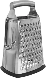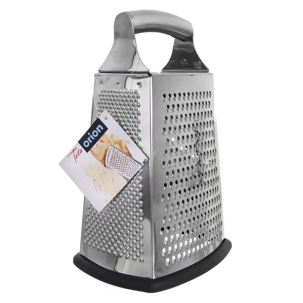 Universele 4-zijdige rasp van roestvrij staal voor fijn en grof raspen, plakjes snijden en pletten. Dankzij de ergonomische greep en de brede antislipbasis wiebelt hij niet en blijft hij stabiel op het werkblad. Perfect voor salades, het garneren van gerechten en dagelijks koken.