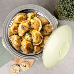 Sluiten met een draai deksel gaat snel en praktisch. De thermoschaal is niet 100% lekvrij – voor veilig transport altijd rechtop dragen. Voor een langere warmhoudtijd de schaal vooraf voorverwarmen met heet water (1–2 minuten); voor langere koeling ongeveer een uur in de koelkast zetten.