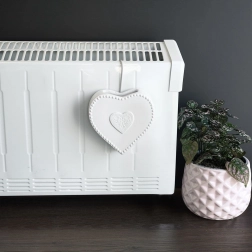 Witte glazuur, een parelrand en een reliëf hartmotief geven zowel de radiator als de ruimte een elegante uitstraling.