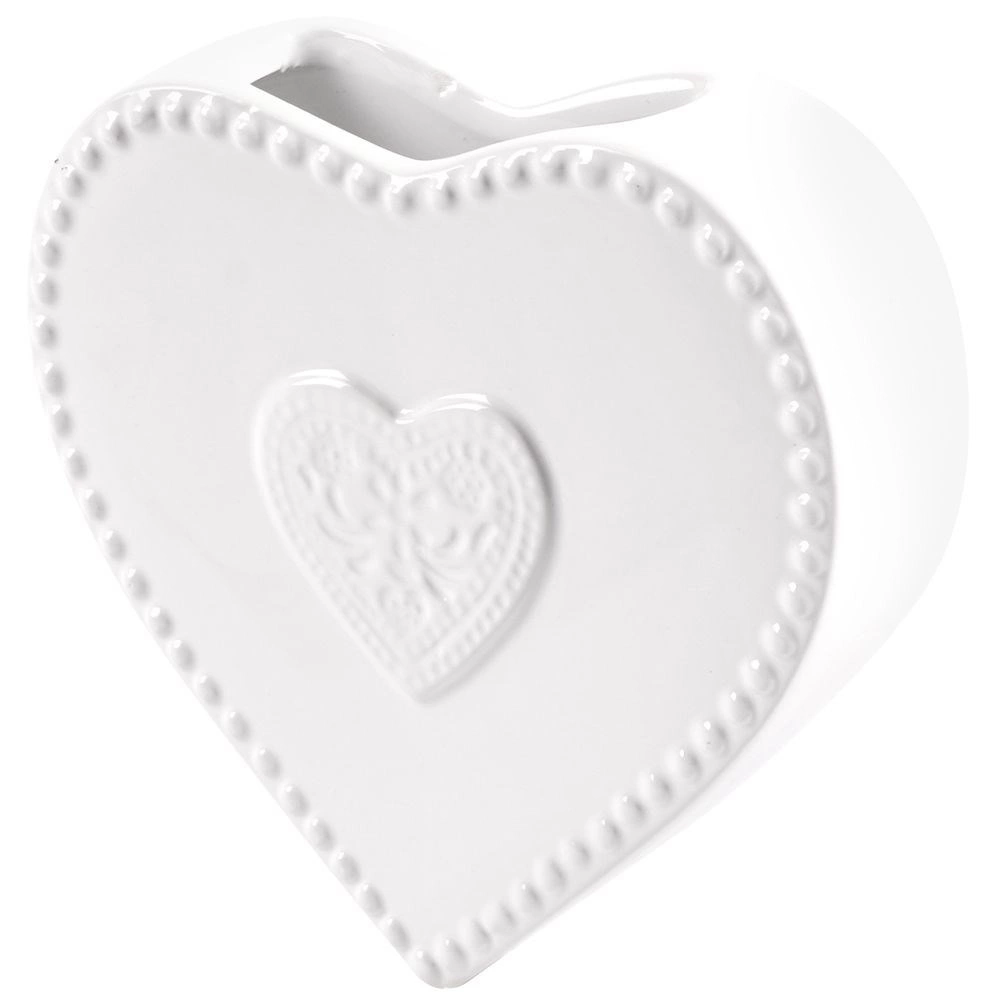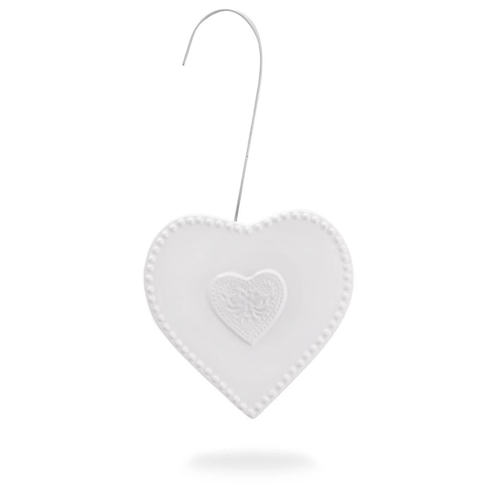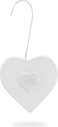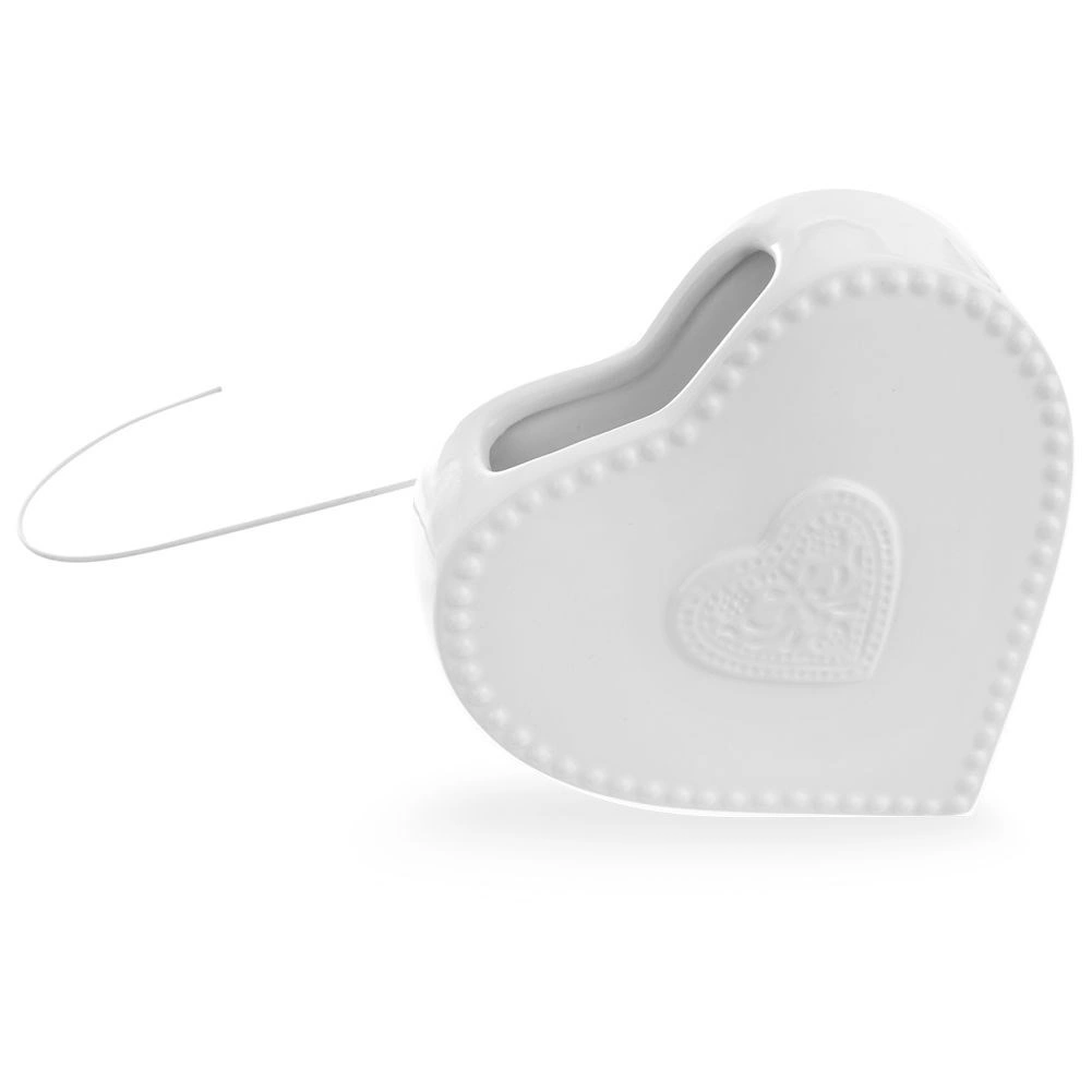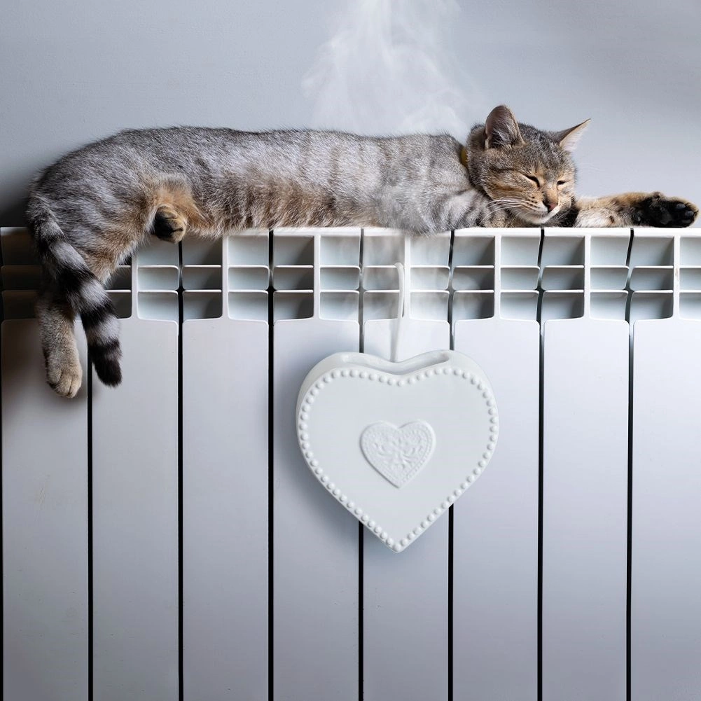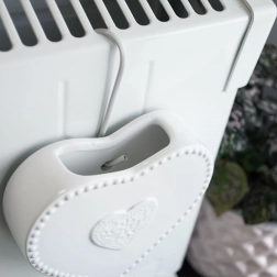 Deze witte keramische radiator-luchtbevochtiger met subtiel hartreliëf is een praktische oplossing tegen droge lucht in de verwarmingsperiode. Vul hem eenvoudig met water en hang hem aan de radiator met de metalen haak – het water verdampt geleidelijk en verbetert het binnenklimaat.
