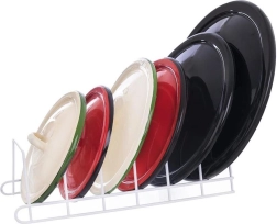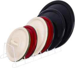De standaard is geschikt voor verschillende maten en types – van deksels met knop tot platte borden en snijplanken, zowel in de kast als op het aanrecht.