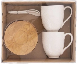 Elegante set van twee porseleinen mokken met een inhoud van 370 ml, inclusief bamboe onderzetters en porseleinen lepeltjes in een geschenkverpakking. De mokken hebben een reliëfdecor, comfortabele oren en zijn geschikt voor de vaatwasser en magnetron (zonder onderzetter). De bamboe onderzetters beschermen de tafel tegen warmte en krassen.