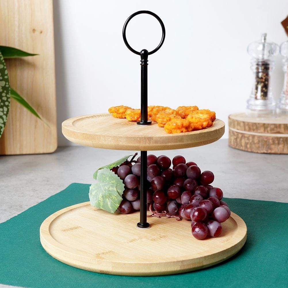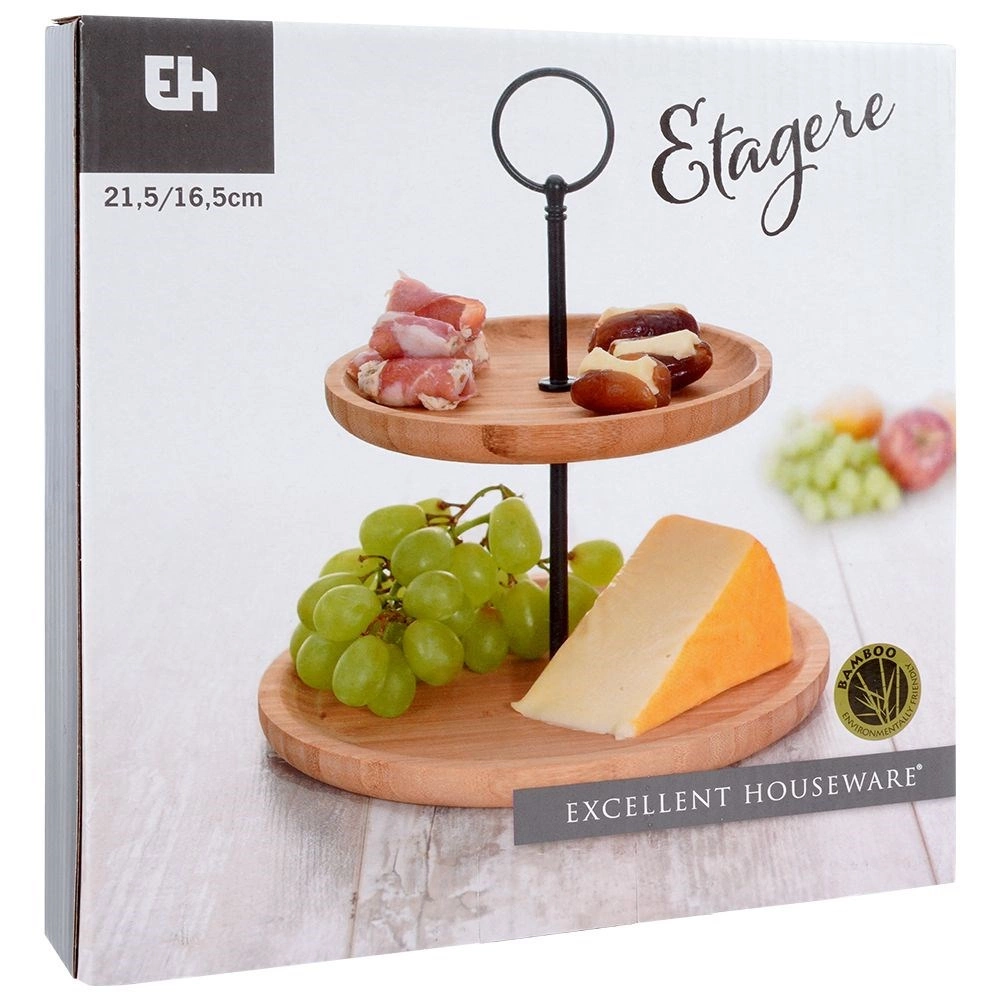 Geef je tafel een elegante toevoeging: een tweelaagse etagère van natuurlijk bamboe met een robuuste metalen constructie in het zwart. Ideaal voor cupcakes, koekjes, mini-desserts, fruit en hartige hapjes. De twee niveaus besparen ruimte en zorgen tegelijk voor een opvallende presentatie.