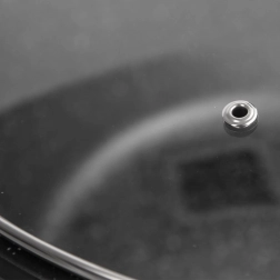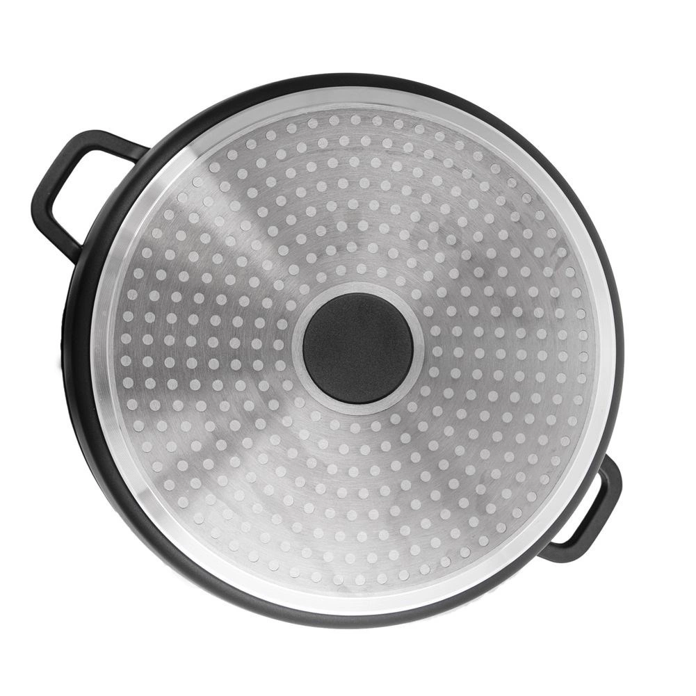 Het deksel met stoomventiel maakt kookcontrole mogelijk, de robuuste zijhandgrepen zorgen voor veilig dragen van de pan.