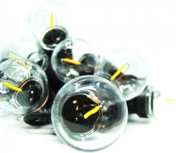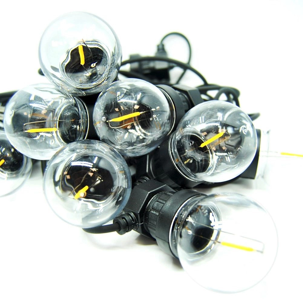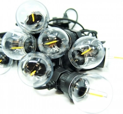 Bolvormige lampen met LED-filamenten geven aangenaam warm licht dat de sfeer van een avond op het terras of een tuinfeest versterkt.