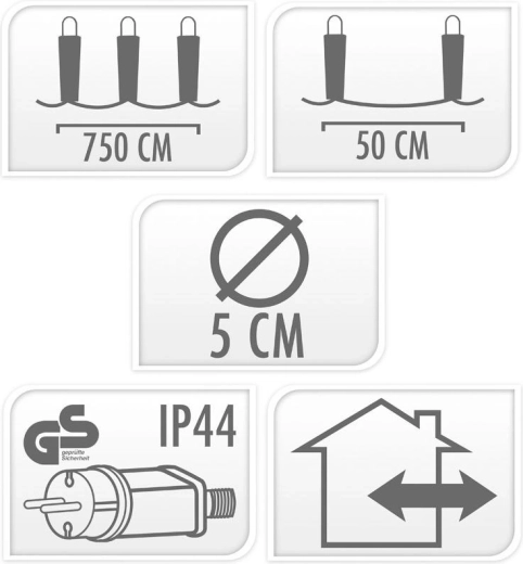 Stijlvolle lichtslinger van 7,5 m met 10 LED-lampen met een diameter van 5 cm voor warme, sfeervolle verlichting op terras, balkon en in de tuin. Biedt universeel gebruik binnen en buiten, eenvoudige installatie dankzij haakjes aan elke fitting en zuinige werking. Netvoeding, IP44 voor buitengebruik.