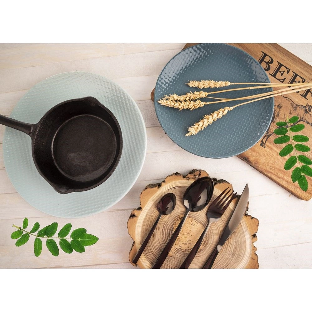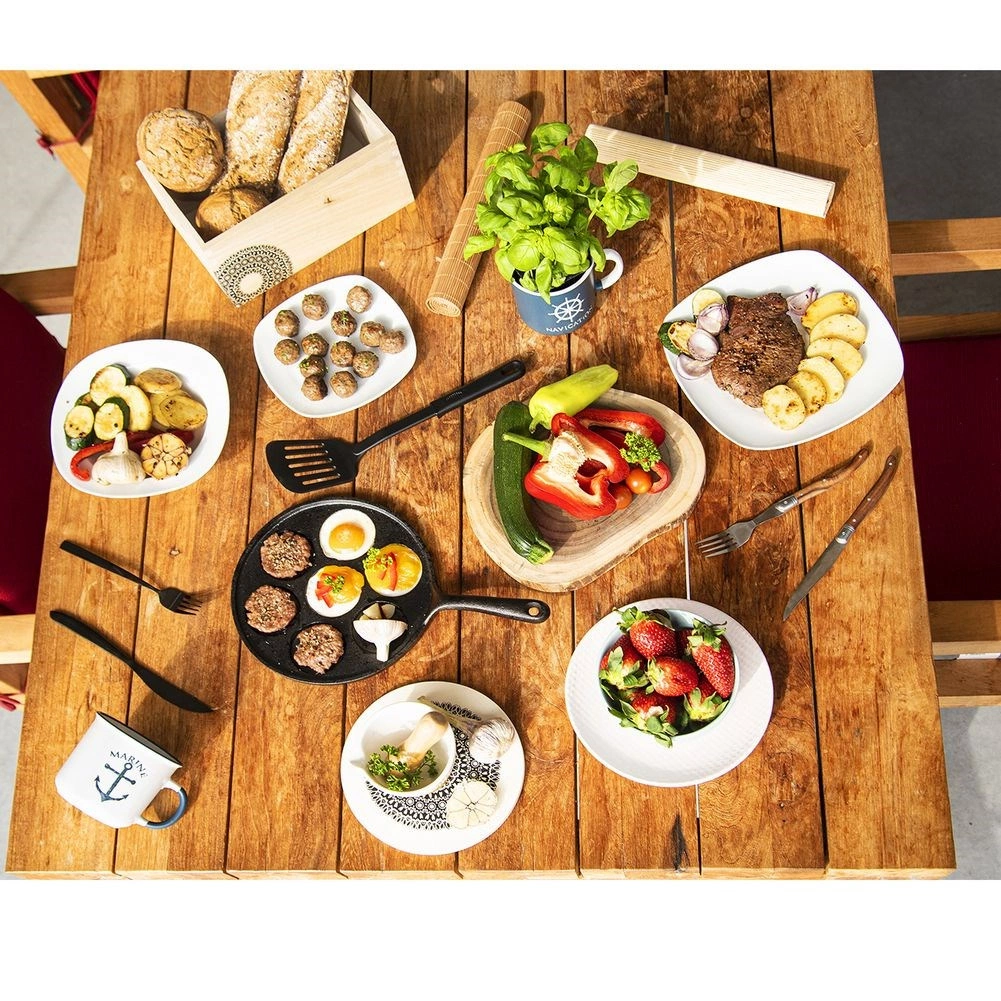 De set bevat alles voor comfortabel tafelen: 6× soeplepel (21,5 cm, breedte 4,5 cm), 6× vork (21 cm), 6× mes (23,5 cm) en 6× theelepel (14 cm). Duurzaam roestvrij staal en hoogwaardige afwerking zorgen voor een lange levensduur. Het bestek is vaatwasmachinereinigbaar, maar voor het behoud van de perfecte uitstraling raden we voorzichtig handwas aan.